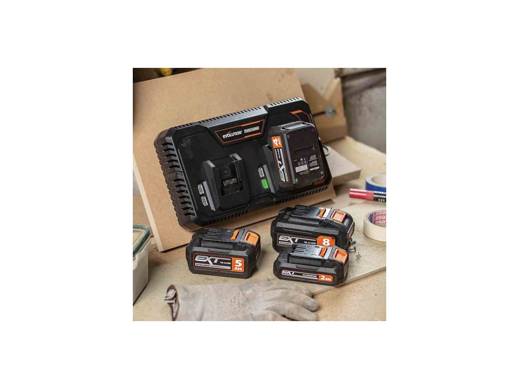 Inteligentní rychlá nabíječka baterií s dvojitým portem pro nové bezdrátové elektrické nářadí EXT Li-Ion 18 V od EVOLUTION.
