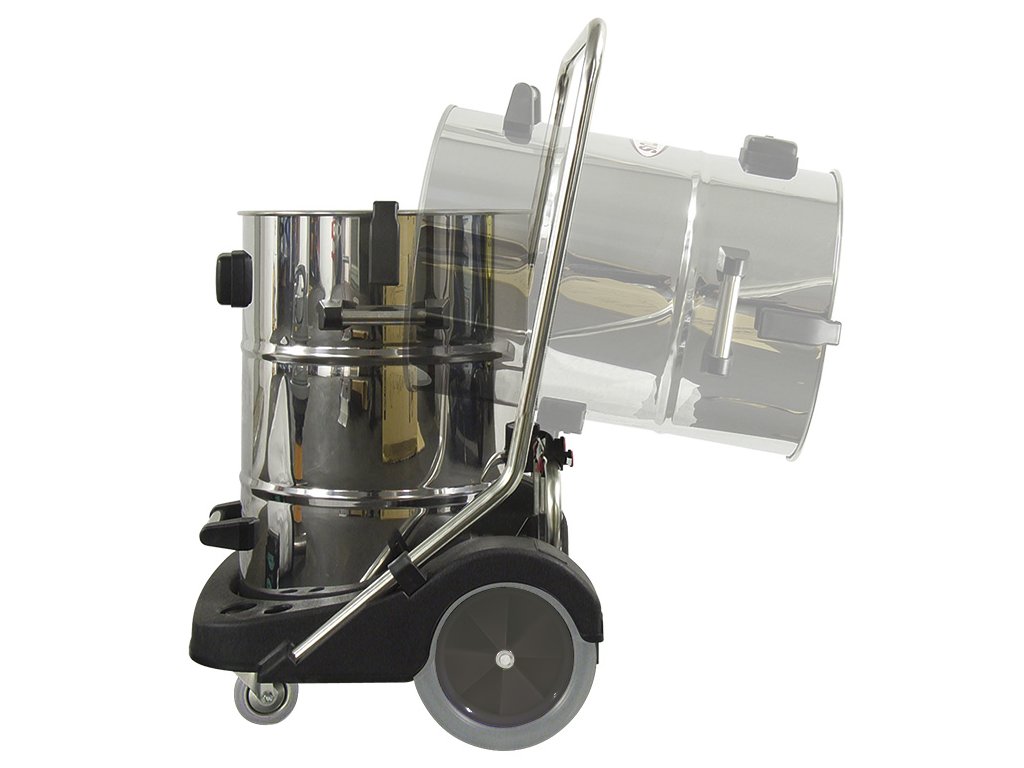 Mokro-suchý vysavač z nerezové oceli, 3 nastavitelné turbíny, objem nádoby 77 litrů.