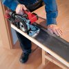 Zdvihnutím tlačítka lze ruční pilu od vodící lišty odpojit. Pevný doraz a díky velké stupnici přesně nastavitelný posuvný doraz umožňují přesný řez pod úhlem.