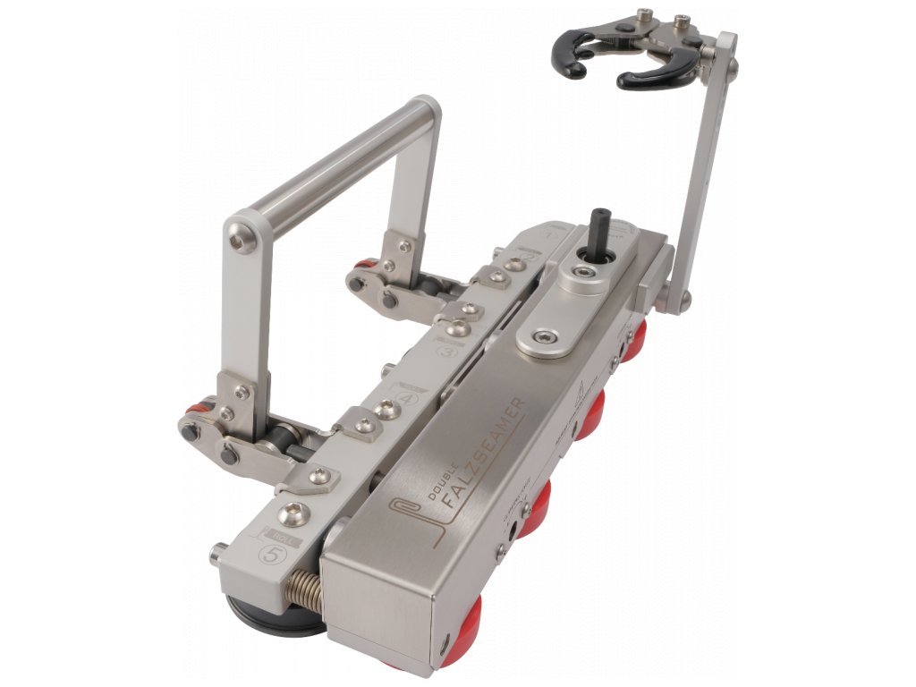 DOUBLE SEAMER je moderní ruční falcovací stroj pro dokonalé a snadné spojování krytinových plechů s jednoduchou úhlovou nebo dvojitou stojatou drážkou v jedné operaci. Je vhodný pro práci s plechy z oceli, nerezu, lakované oceli, titanzinku, hliníku a mědi.