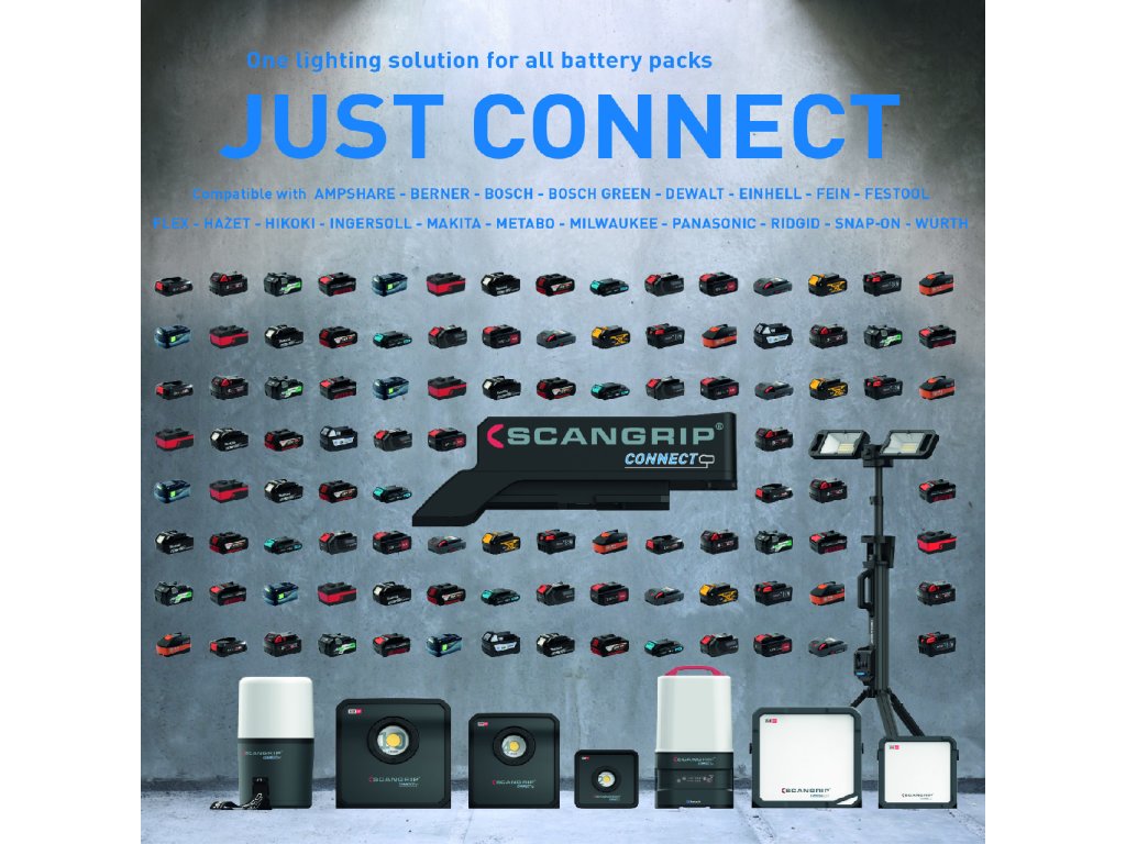 - DUO CONNECT je kompatibilní s METABO / CAS bateriovým systémem 18 V a všemi ostatními 18 V/20 V bateriovými sadami předních značek elektrického nářadí pomocí SCANGRIP CONNECTOR. Kromě toho lze SCANGRIP POWER SUPPLY použít pro přímé napájení poskytující neomezenou dostupnost světla.